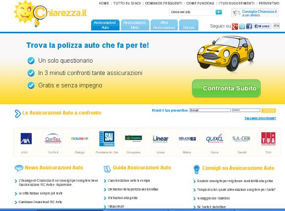Chiarezza.it permette di confrontare in pochi minuti i preventivi di diverse compagnie assicurative (AXA Assicurazioni, Conte.it, Dialogo Assicurazioni, Fondiaria Sai, Groupama assicurazioni, Intesa Sanpaolo Assicura, Linear, Quixa, Reale Mutua Assicurazioni, SA-CEBI, TUA Assicurazioni)