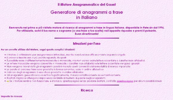 Il Motore Anagrammatico del Gaunt è il primo motore “anagrammatico” in italiano attivo da oltre 13 anni. Da allora ha generato oltre 350.000.000 (avete letto bene… 350 milioni!!!) di anagrammi.