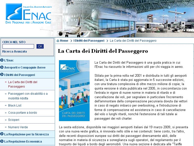 Dal sito dell’ENAC (Ente Nazionale per l’Aviazione Civile) è possibile scaricare la Carta dei Diritti del Passeggero, cioè un opuscolo con tutti i diritti dei gli utenti delle compagnie aeree