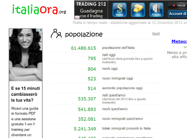 Ed inoltre: quante persone sono nate o morte oggi o in quest’anno, il numero delle carte di credito in Italia, il numero dei matrimoni e delle separazioni di quest’anno in Italia, il numero dei lavoratori precari, dei lavoratori a tempo indeterminato e dei disoccupati, il numero degli sms inviati oggi, il numero dei cellulari venduti oggi, quanti video sono stati caricati su youtube oggi, il numero dei profili italiani su facebook, il costo del Quirinale e della Camera, i furti nelle abitazioni e tanto altro…