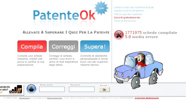 PatenteOk.com è un sito che vi permette provare i quiz per la patente. Dopo aver compilato il compito il sito vi indica gli errori commessi