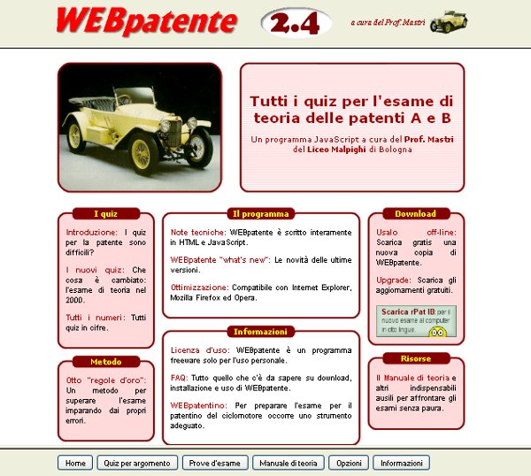 WebPatente è un altro completo simulatore di di esame per la patente A e B. Presenta anche una utile sezione con la teoria e con tanti consigli utili per superare l’esame per la patente. WebPatente è anche un software che può essere anche scaricato gratuitamente e utilizzato offline