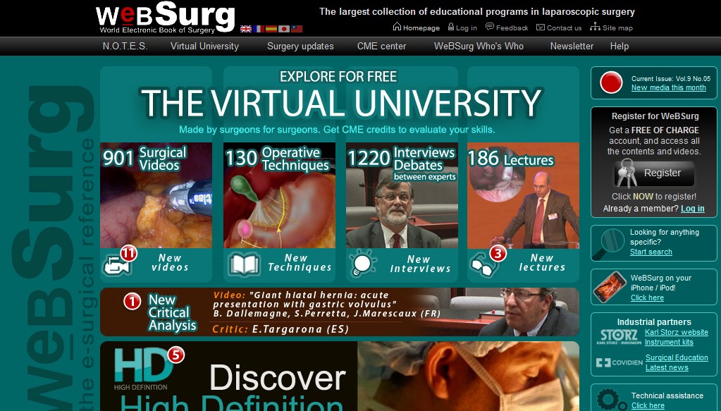 E se siete dei medici potete registrarvi su WebSurg e vedere così centinaia di video di inteventi chirurgici (soprattutto laparoscopici) ad alta qualità. Inoltre potrete leggere anche interessanti capitoli interattivi in cui vengono spiegate le varie tecniche chirurgiche. Tutto il materiale è suddiviso per specialità (chirurgia generale e dell’apparato digerente, endoscopia, chirurgia robotica, chirurgia endocrina, chirurgia pediatrica, chirurgia ginecologica, chirurgia urologica, chirurgia toracica e cardio-chirurgia). Inoltre troverete video dibattiti con i migliori chirurghi e video ad alta definizione HD (a pagamento)